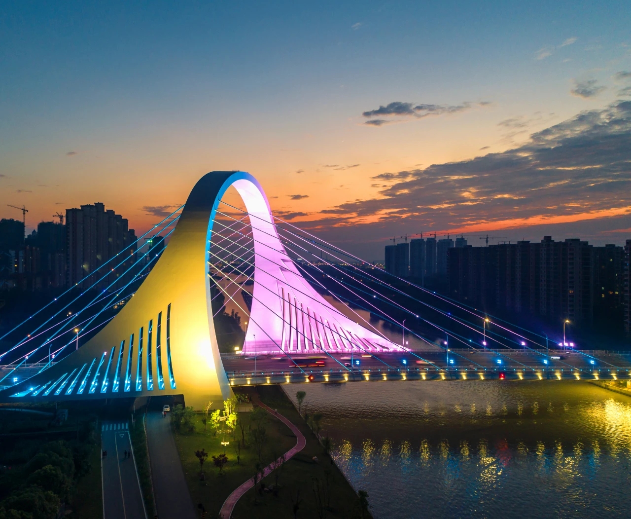 2021年9月16日,京杭运河淮海路大桥改建工程竣工验收会议顺利召开。该桥主桥采用空间异型拱形钢主塔结构,塔高75米,塔宽60米,共27个节段,每个节段均由空间曲线扭曲构成。此次参会有市交通局相关领导、设计方、施工方、监理方等相关单位参会。会上提到:本次工程不仅有利于完善区域路网,改善交通环境,方便周边群众出行;还可以推进“美丽临平”建设和运河美丽乡村精品村(区块)建设,助力大运河文化带建设和保护。