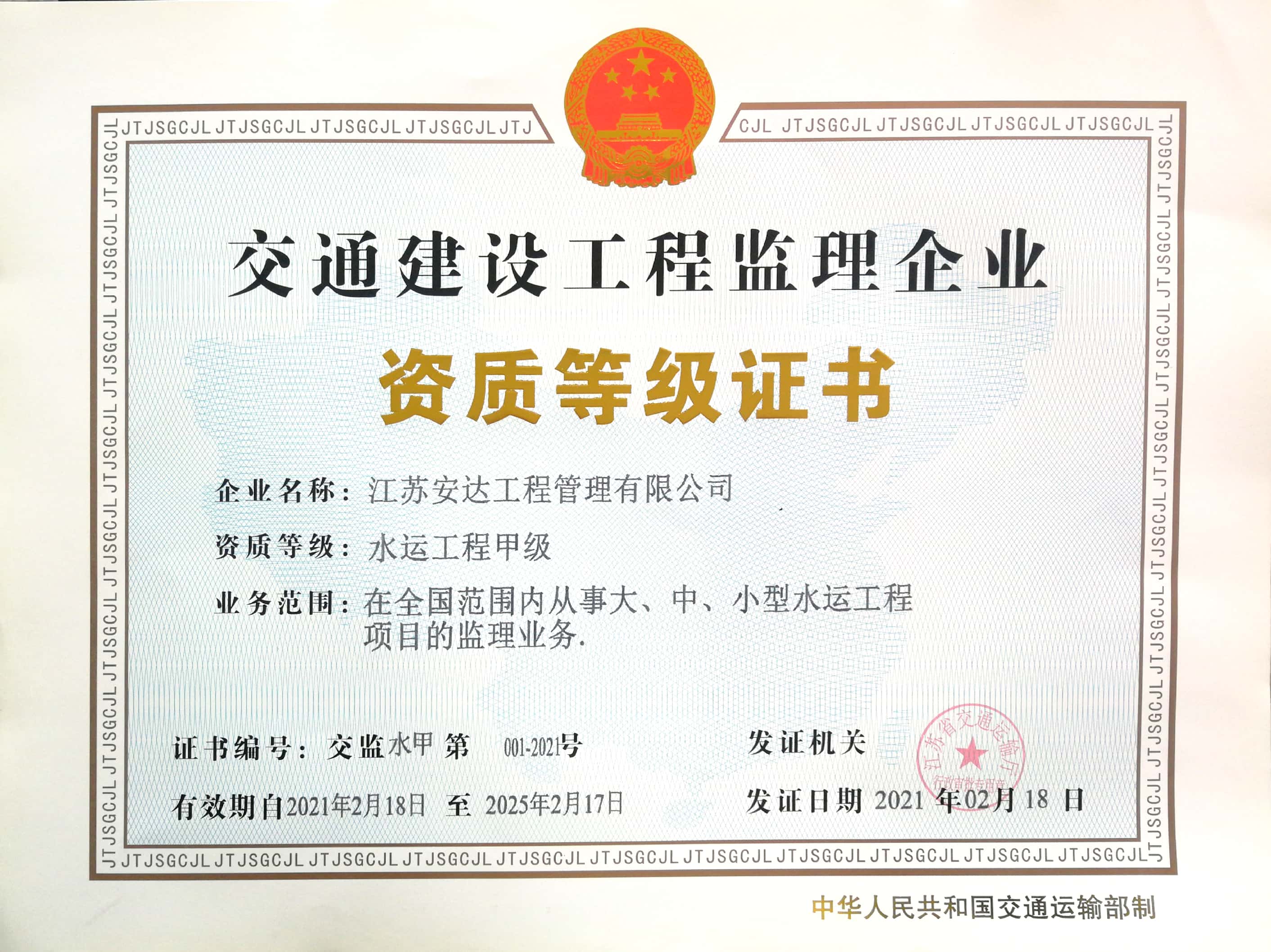 截止目前,开云球赛_开云(中国) 已拥有交通运输部公路工程甲级、水运工程甲级、市政公用工程乙级、房屋建筑工程乙级监理资质;同时还具有公路工程、市政公用工程施工总承包叁级,公路路面工程专业承包叁级施工资质等多项资质,促进了工程管理格局持续优化,资质等级结构大为改善,资质体系不断优化完善,为企业长远发展打下了坚实基础。
