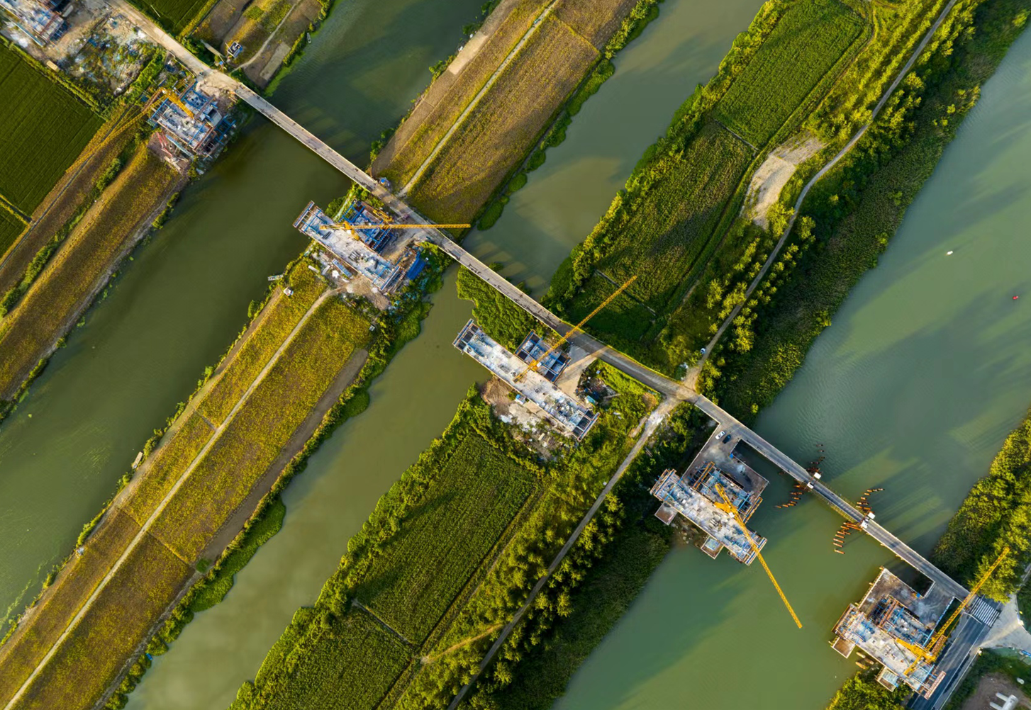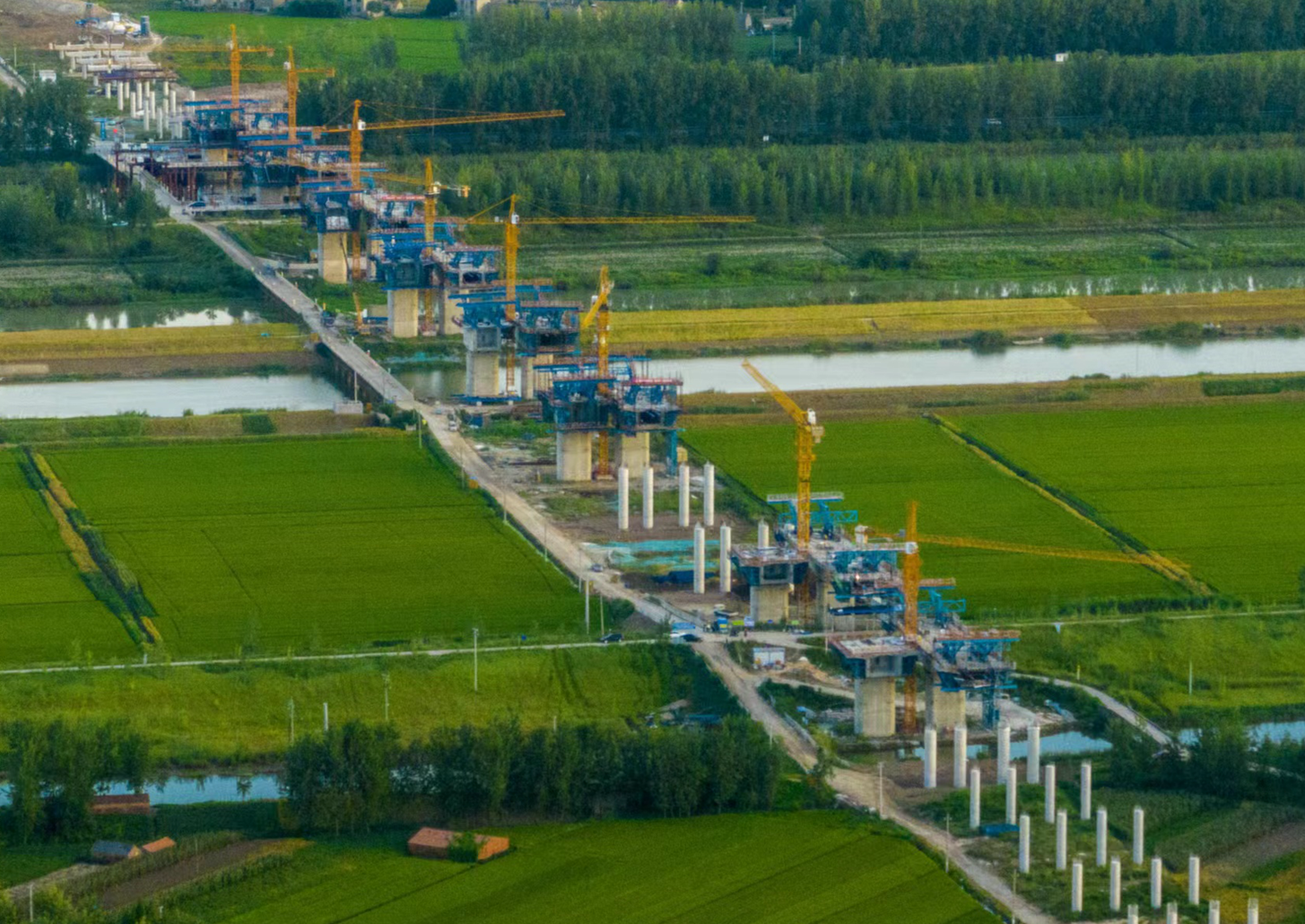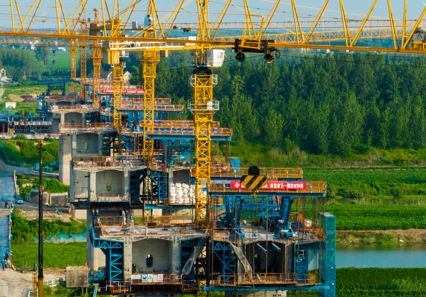2022年9月22日,江苏省淮安市淮安区,江苏省重点交通工程264省道淮安区段跨淮河入海水道特大桥项目现场塔吊林立,一片热火朝天的建设场景。为确保特大桥早日完工,施工单位中交三航局抢抓晴好天气,通过交叉作业,密集施工等多工序同步推进全力推动重大交通工程加快建设。